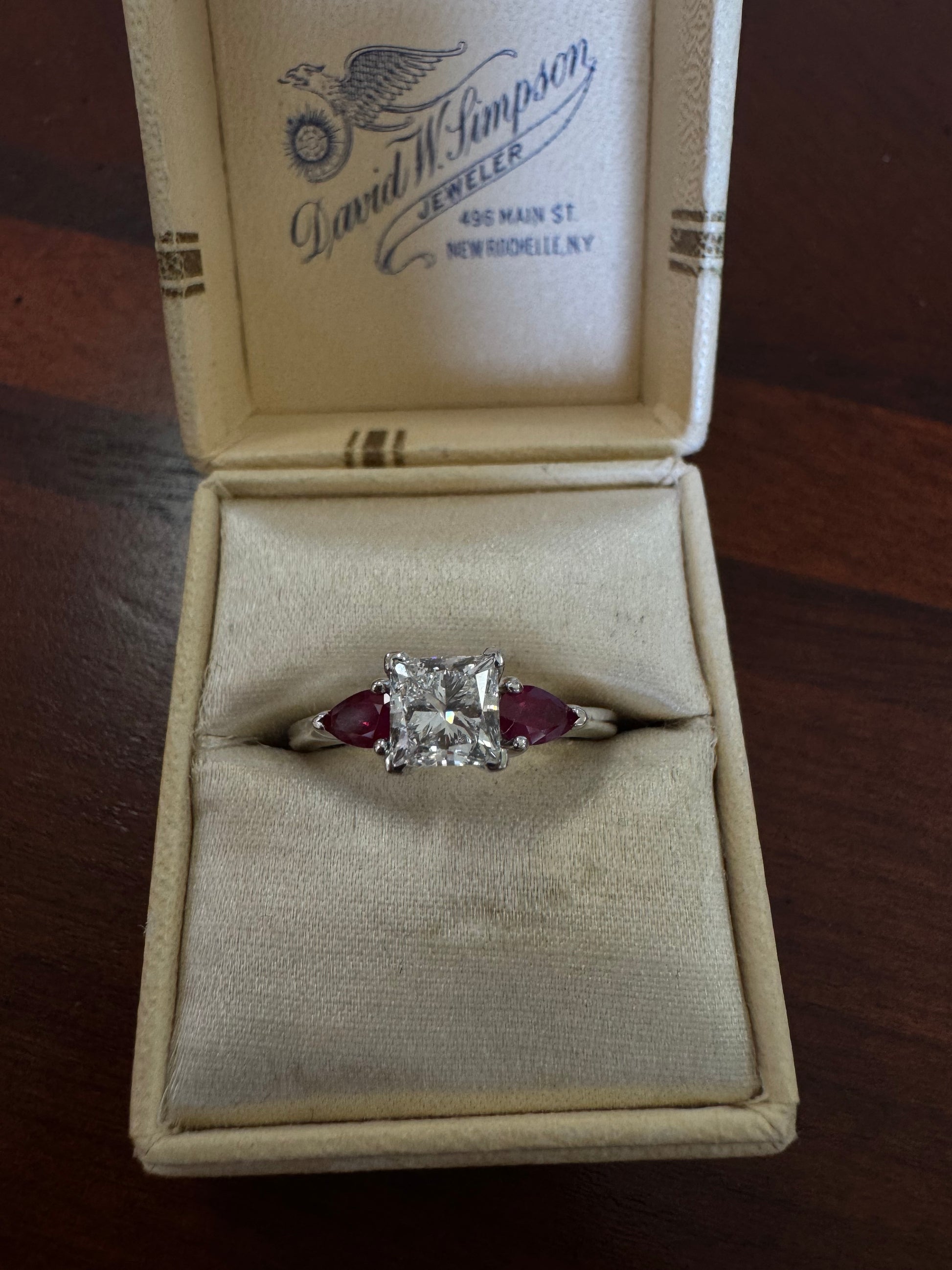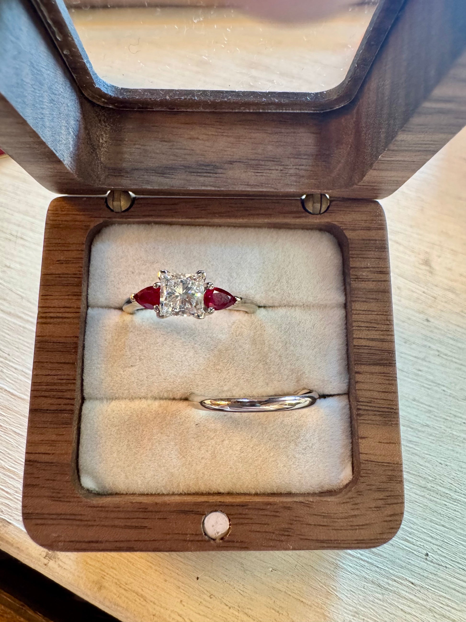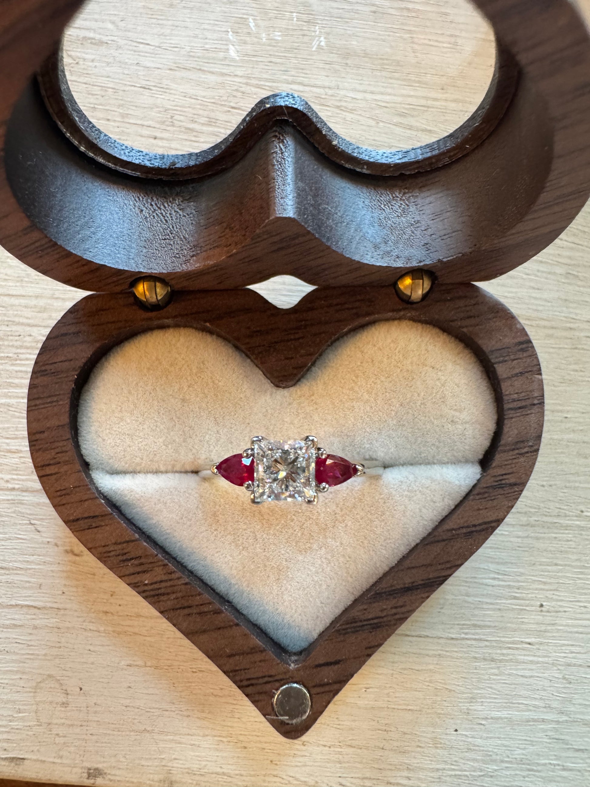 1.03ct princess cut lab grown diamond E color VS2 clarity set in 14k white gold with a natural pear shaped ruby on each size 7 R311