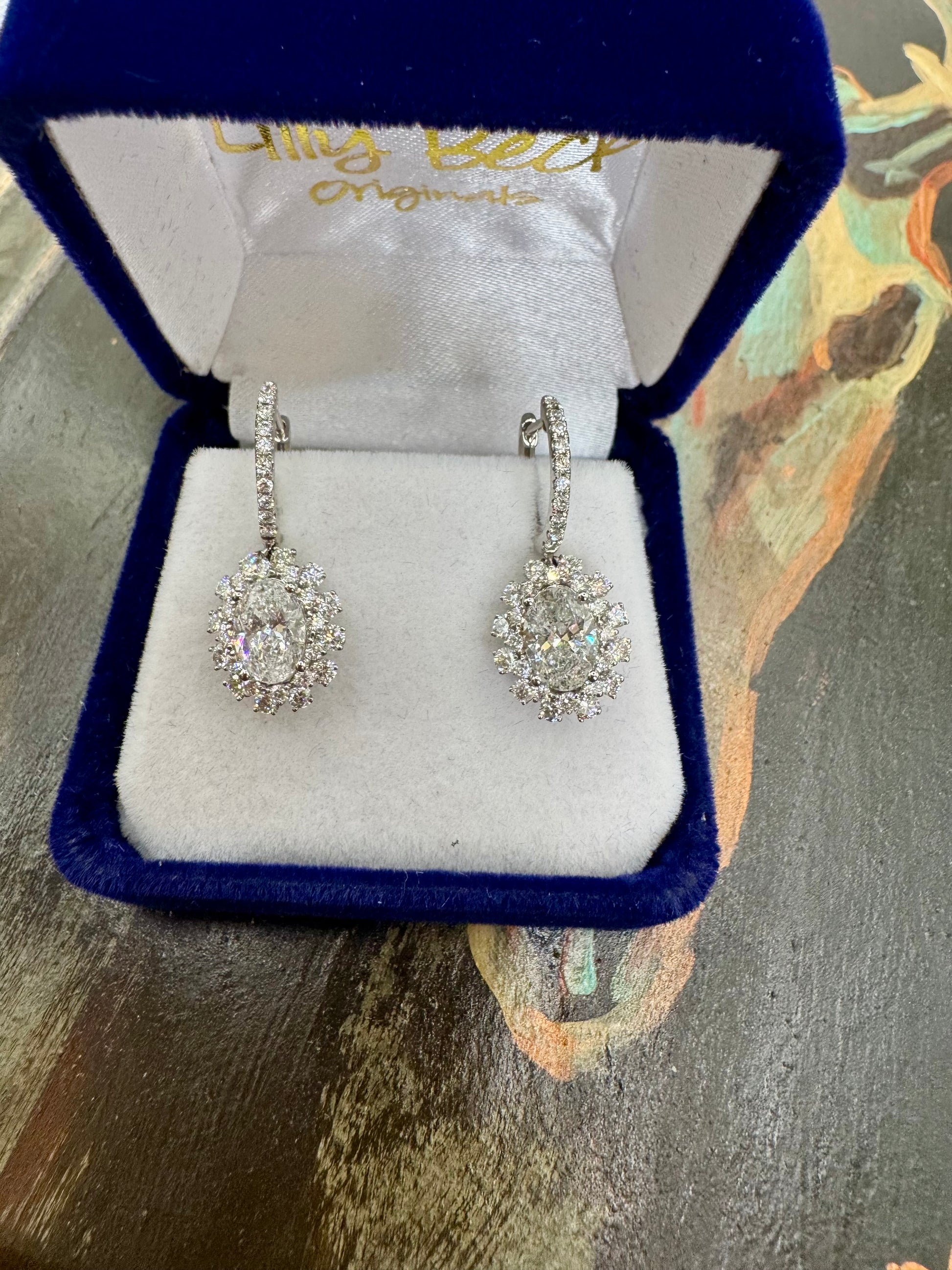 2.00ctw oval Diamond & 1.15ctw Round Diamonds Drop Earrings set in White Gold