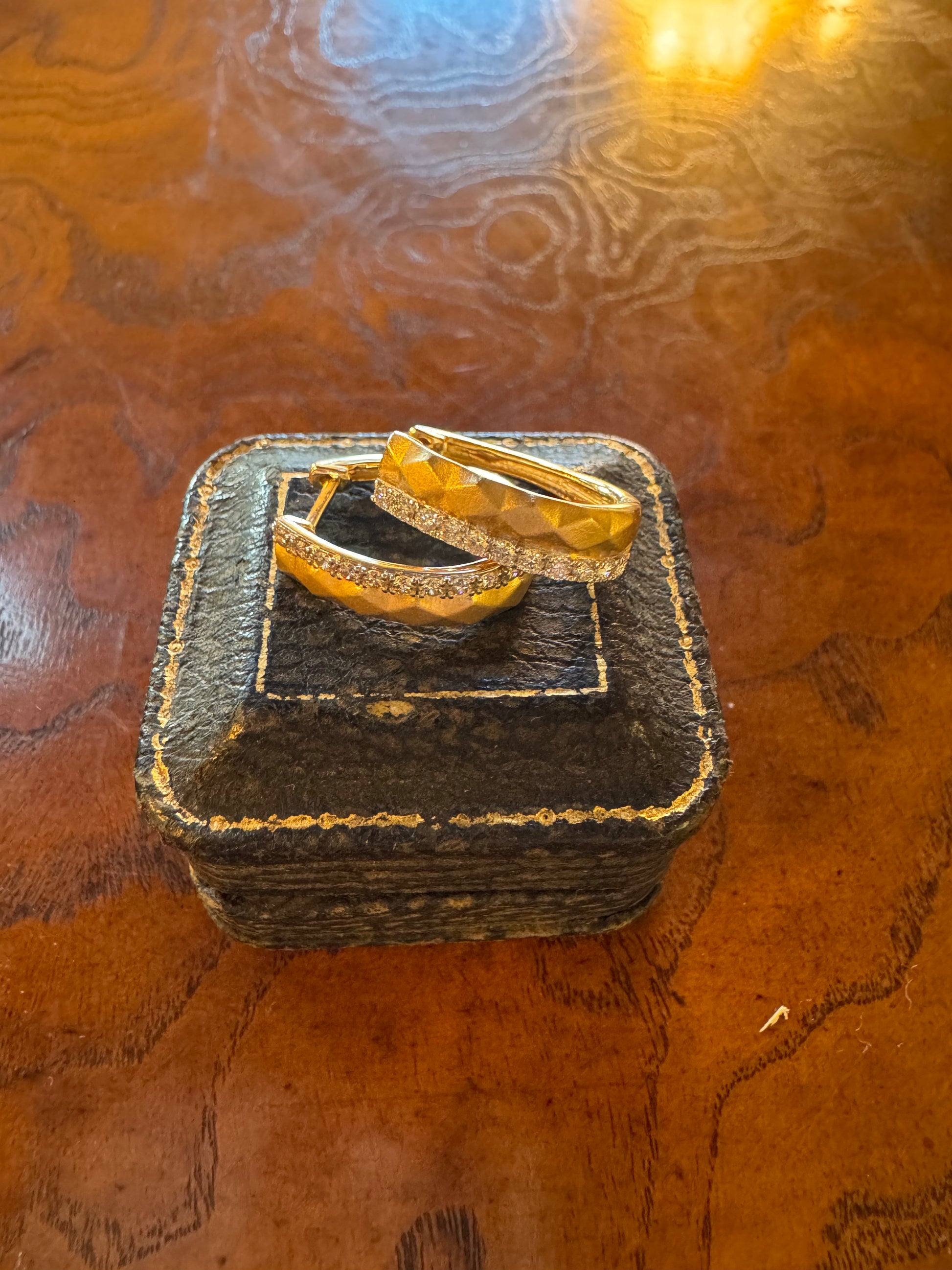 A timeless pair of half-carat ( .51ct ) diamond hoops set in rich 14k yellow gold. These feature a faceted, brushed-gold pattern on one side and a sleek row of sparkling diamonds on the other — the perfect mix of everyday elegance and elevated shine. E12