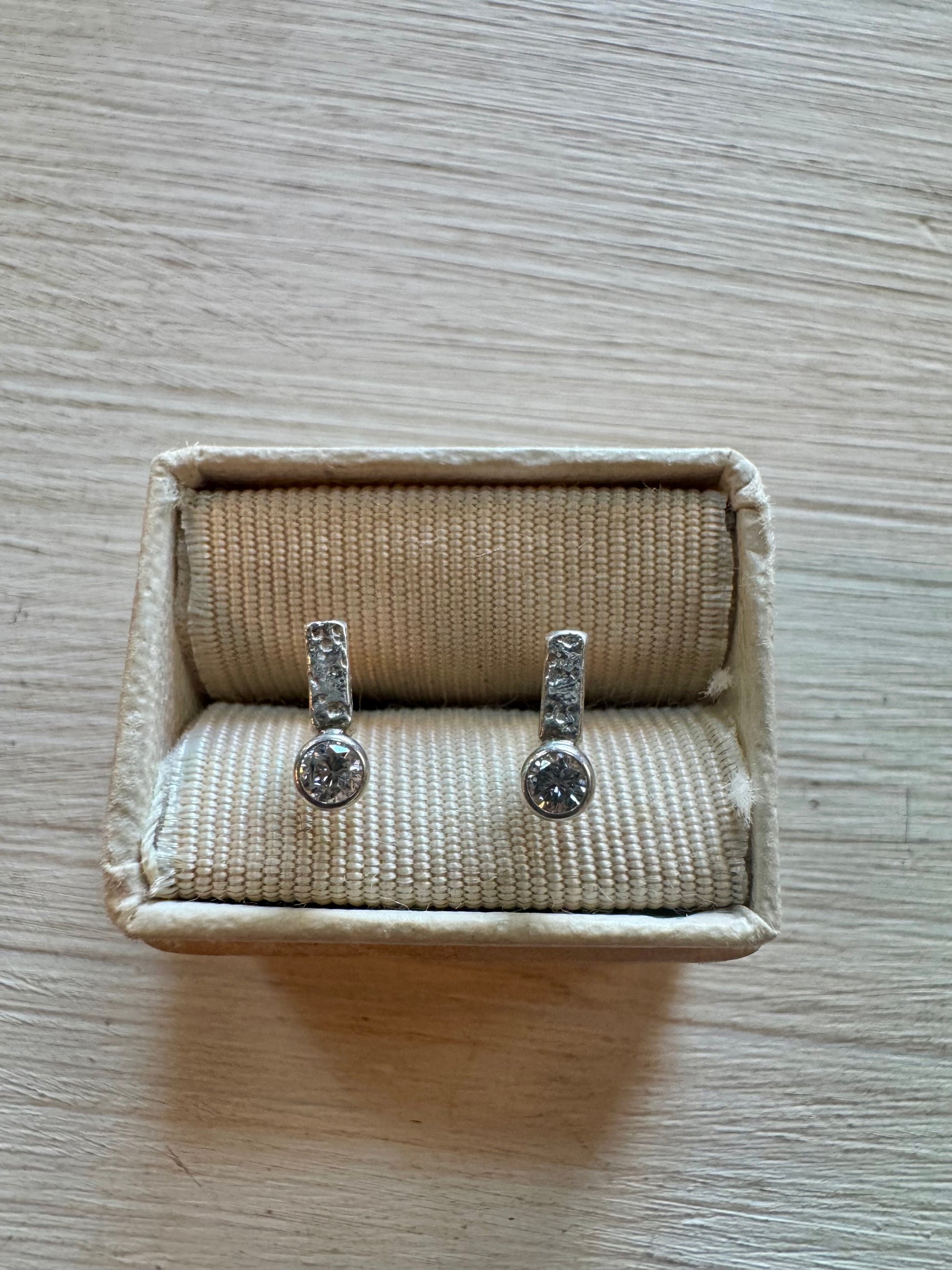 These sweet Diana Widman design earrings feature a bezel set Diamonds approx .10cts . Pure silver with large push backs E21