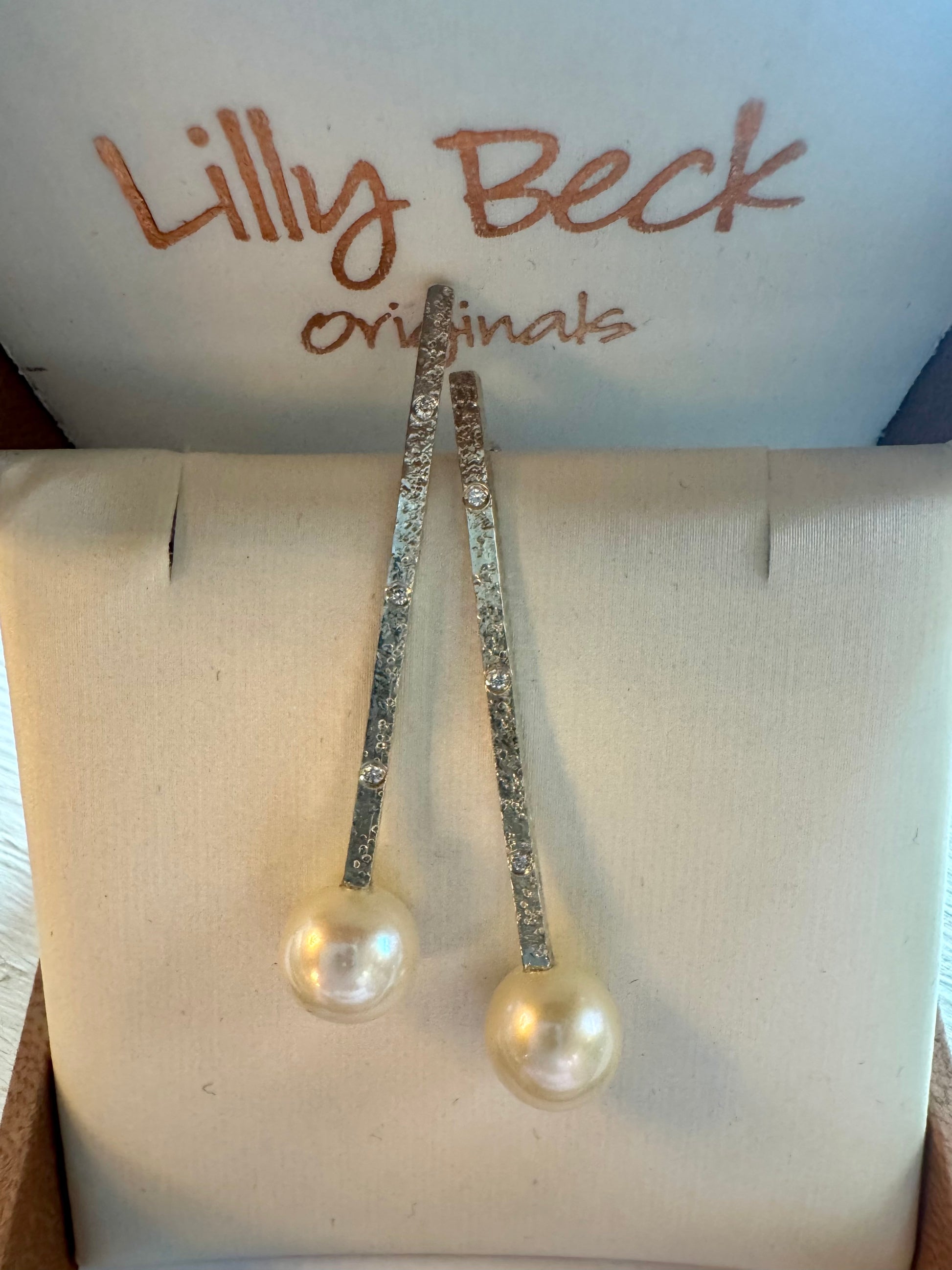 Diana Widman pearl drop earrings. Pure silver with 10mm cultured pearl drops, .01pt Diamonds spaced down the bar. 2” E11